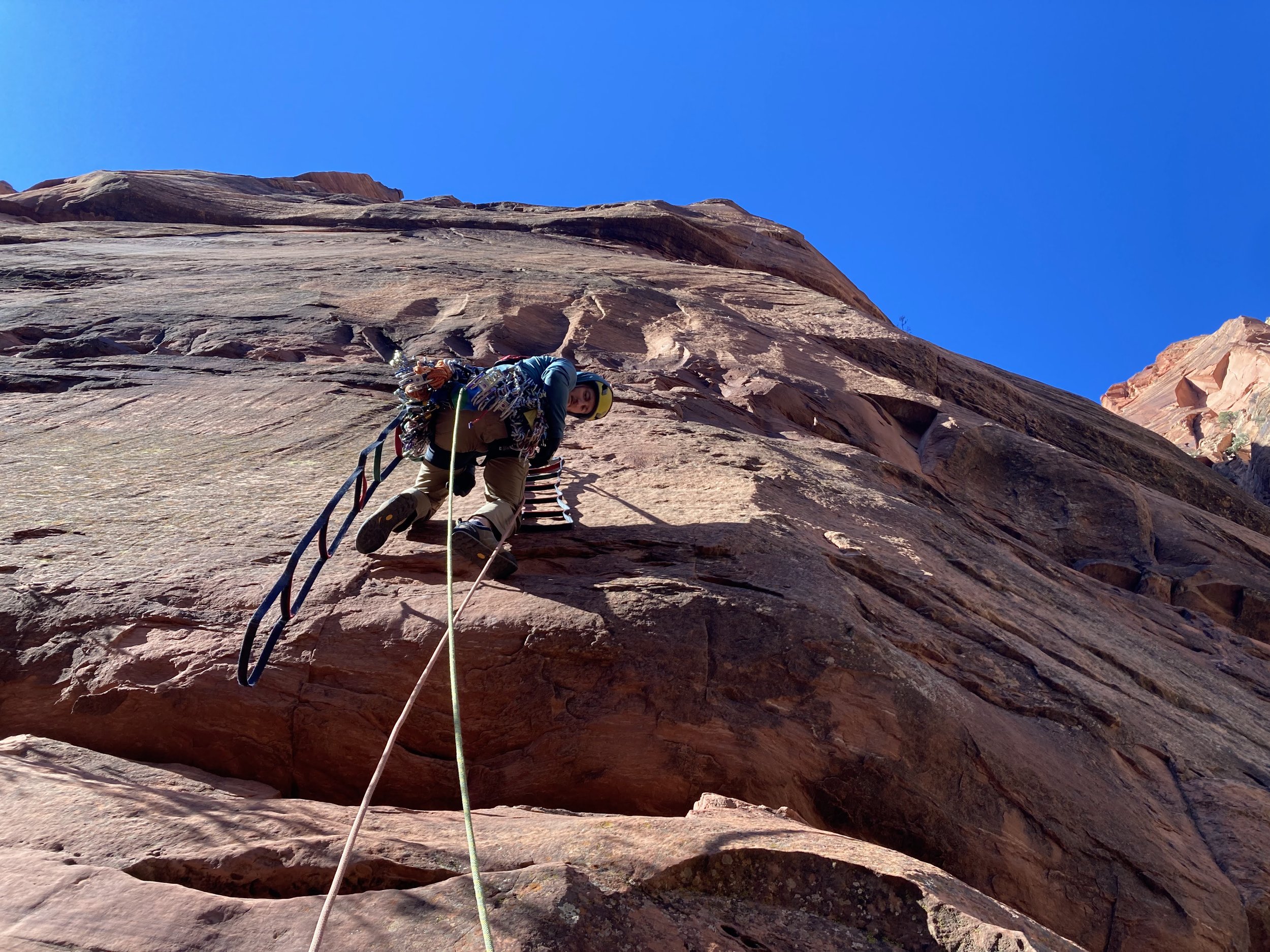 Pitch five was supposed to be Jason's lead, as the route beta called for a beautiful wide hands crack ascending off the fourth pitch ledge. On most big wall trips, few things go according to plan, and this trip was no exception. At the top of the third pitch, Jason began complaining of dehydration and lamented the position of this route in the direct October sun. We spent some focused minutes hydrating and eating, and afterwards I cast off out into the fourth pitch. By the time Jason arrived at the fourth pitch belay an hour later, it was obvious he was having a heat stroke. We positioned Jason between the haul bag and the sandstone wall in a futile attempt to get him out of the sun, and before long our situation worsened.